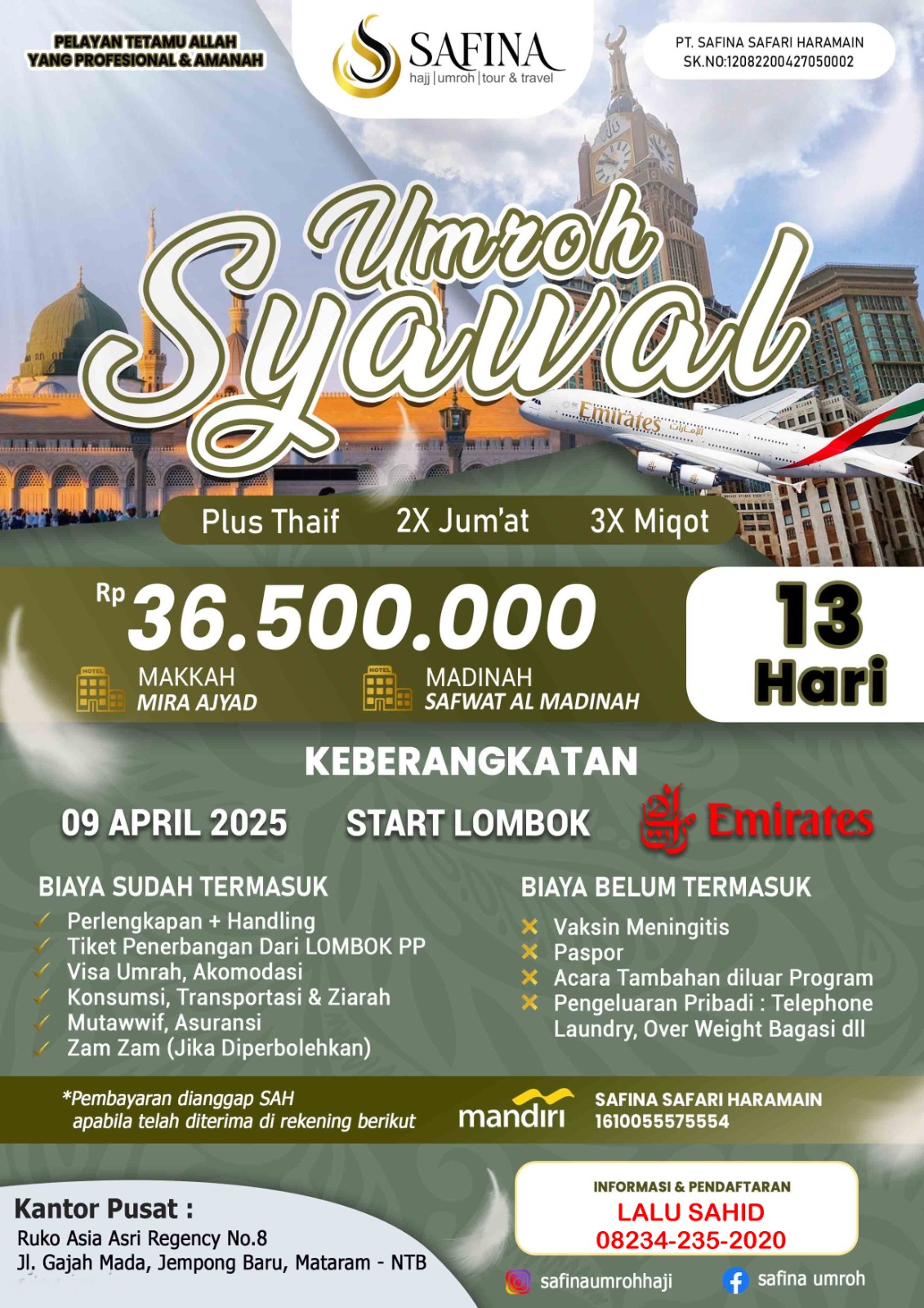 Paket Umroh Umroh 13 Hari 9 April 2025 Star Lombok dengan Maskapai EmiratesadminFebruari 1, 2025Maret 11, 2025Paket2454 Dilihat Post Views: 2,454 Related PostsUmroh Awal Ramadhan 13 Hari Berangkat 17 Februari 2026Umroh 13 Hari Plus Tour DubaiUmroh bersama TGH Ilham Yusron, Berangkat 22 Juli 2025Umroh Akhir Tahun, Berangkat 23 Desember 2025Umroh Bulan Juli, Agustus, September, Oktober, Nopember dan Desember 2025 untuk 13 Hari29 September 2025, Umroh 14 Hari Terbang dengan GarudaUmroh Super Promo 12 Hari Paket Ekonomi Rp26.9 Juta Berangkat Agustus 2025Umroh Super Promo 12 Hari Paket Standar Rp28.9 Juta Berangkat Agustus 2025 Jangan LewatkanUmroh 10 Februari 2026 bersama Dr. TGH. Lalu Ahmad ZaenuriHaji Khusus Paket Ekonomis 190 jutaanUmroh 17 Hari Plus Jordan dan AqsaUmroh Awal Ramadhan 13 Hari Berangkat 17 Februari 2026Umroh 13 Hari Plus Tour DubaiUmroh bersama TGH Ilham Yusron, Berangkat 22 Juli 2025