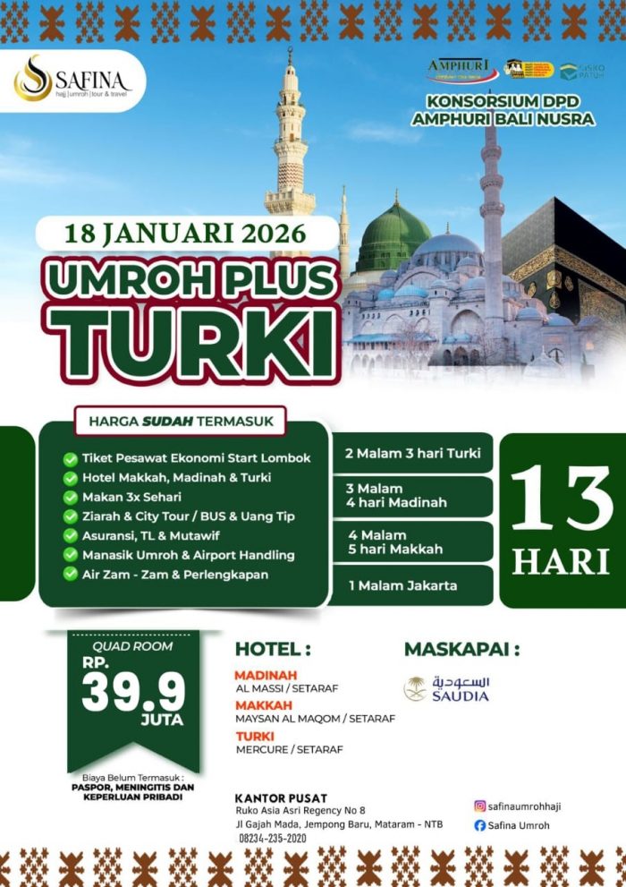 Paket Umroh Berangkat 18 Januari 2026: Umroh + Turki 13 HariadminNovember 7, 2025November 7, 2025Paket466 Dilihat Post Views: 466 Baca Juga: Umroh Akhir Tahun, Berangkat 23 Desember 2025 Related PostsTarget 1500! SAFINA Berangkatkan 290 jamaah Umroh di Bulan Februari 2026Hasil Ladang Kebun, antarkan Niat Suci Mantan Kepala Desa Tepal Umroh123 Jamaah Umrah Safina Mendarat di Jeddah, Bersiap Melaksanakan Rangkaian Tour dan UmrahSafina Berangkatkan 123 Jamaah Umrah Awal Februari 2026Umroh Syawal 14 Hari, Berangkat 31 Maret 2026 Pesawat Emirates + City Tour Dubai Landing MadinahUmroh Syawal 12 Hari, Berangkat 25 Maret 2026 Pesawat batik AirTebar Manfaat! 25 Tahun lebih Mengajar, Safina Travel Serahkan Umroh Gratis untuk Guru Non ASN di Lombok BaratUmroh Super Promo Standar hanya 29.5 Juta 13 Hari berangkat dari Lombok Jangan LewatkanUmroh Syawal 14 Hari, Berangkat 31 Maret 2026 Pesawat Emirates + City Tour Dubai Landing MadinahUmroh Syawal 12 Hari, Berangkat 25 Maret 2026 Pesawat batik AirUmroh Super Promo Standar hanya 29.5 Juta 13 Hari berangkat dari LombokUmroh Super Promo Ekonomi hanya 26.9Juta 13 Hari berangkat dari LombokUmroh 10 Februari 2026 bersama Dr. TGH. Lalu Ahmad ZaenuriBerangkat 25 Januari 2026: Umroh + Dubai 13 Hari Landing Madinah